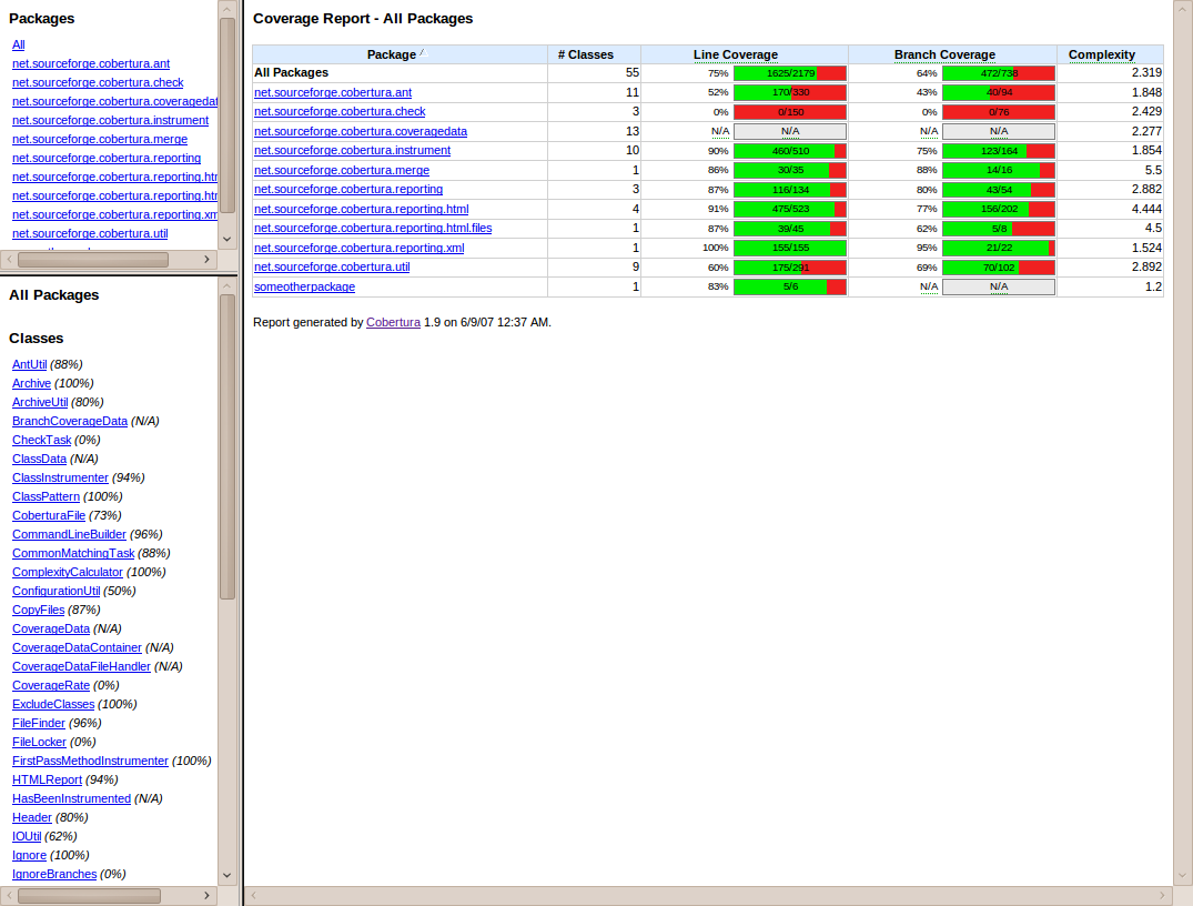 Continuous integration tools, such as Hudson, can often use Cobertura results to graph the test coverage. For this purpose, the Cobertura module also generates an XML format report, in test-result/code-coverage/coverage.xml.