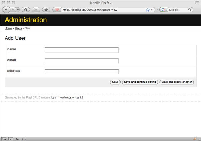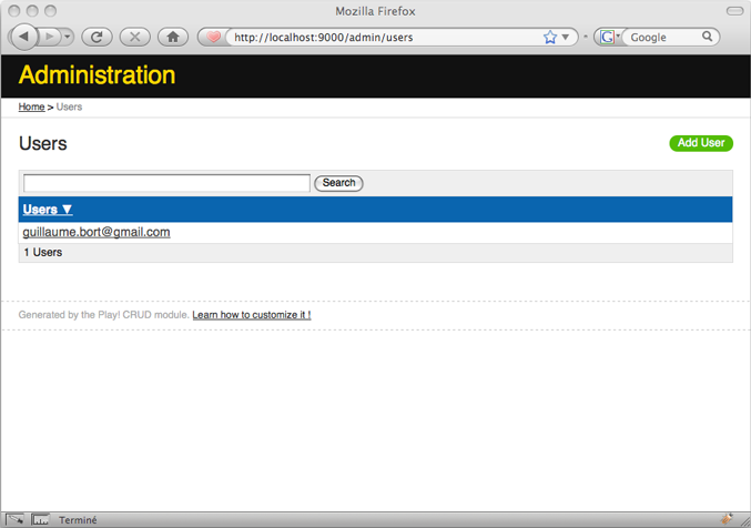 Now open http://localhost:9000/admin and you should see the User admin area.
