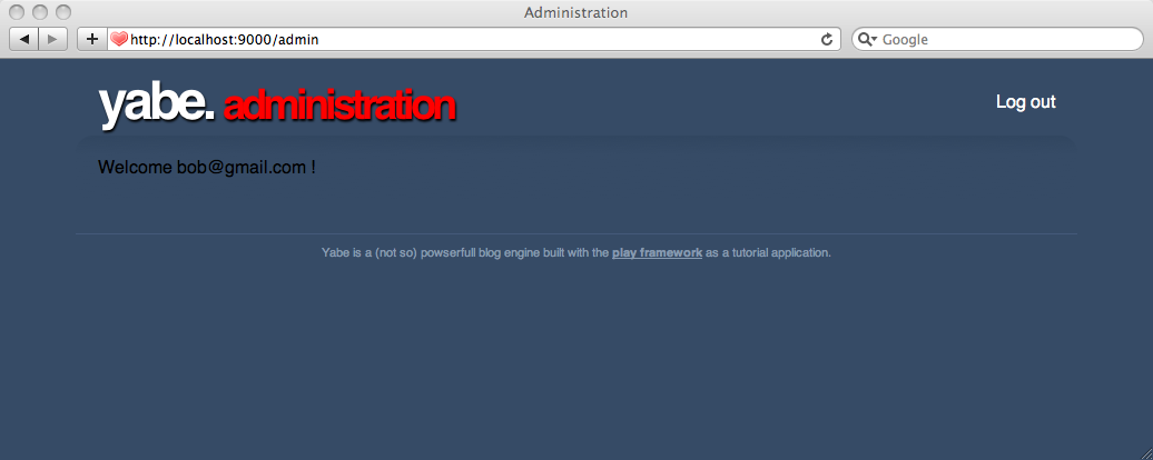 The last thing to make all this new stuff work is to create the yabe/app/views/Admin/index.html template. Let’s start with something simple: