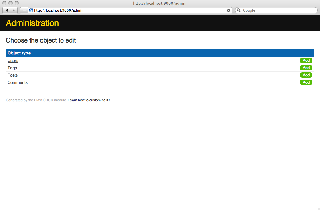 Currently, we have no way to create new blog posts or moderate comments using the blog UI. Play provides an out of the box CRUD module that will help quickly generate a basic administration area.
