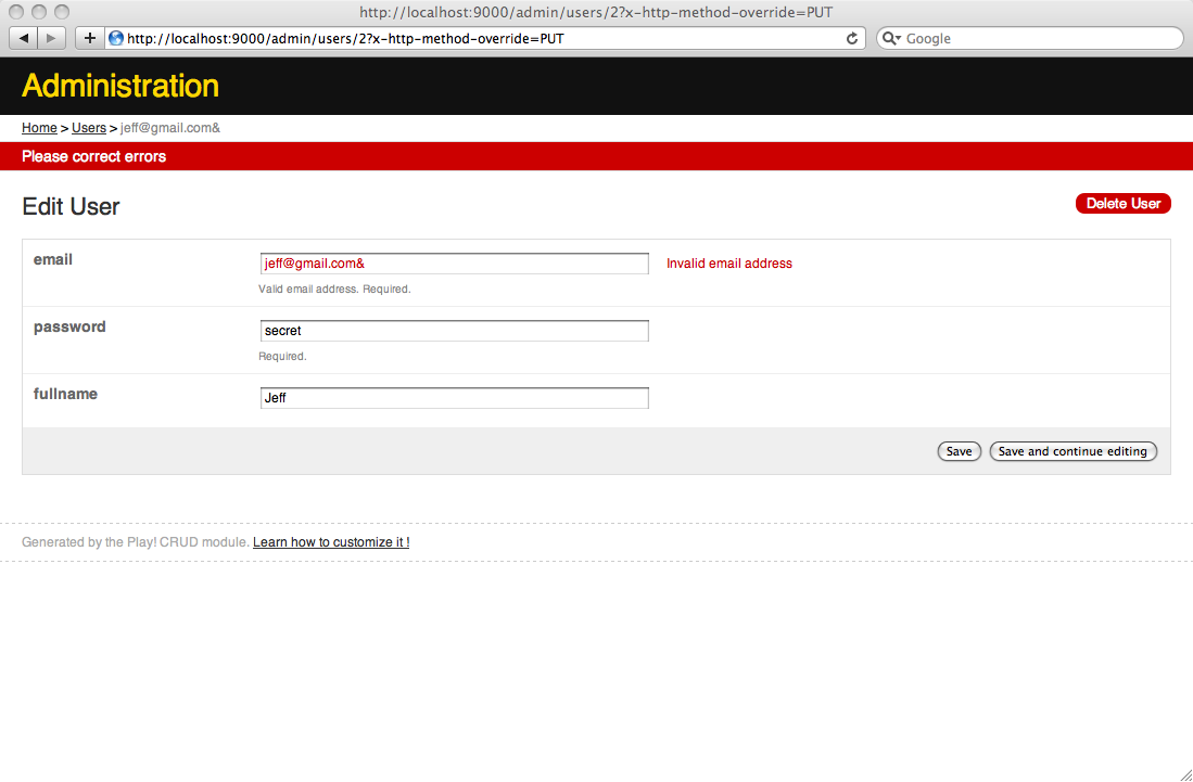 Now if you go to the edition or creation form for the User model object, you will see that validation rules are auto-magically added to the form: