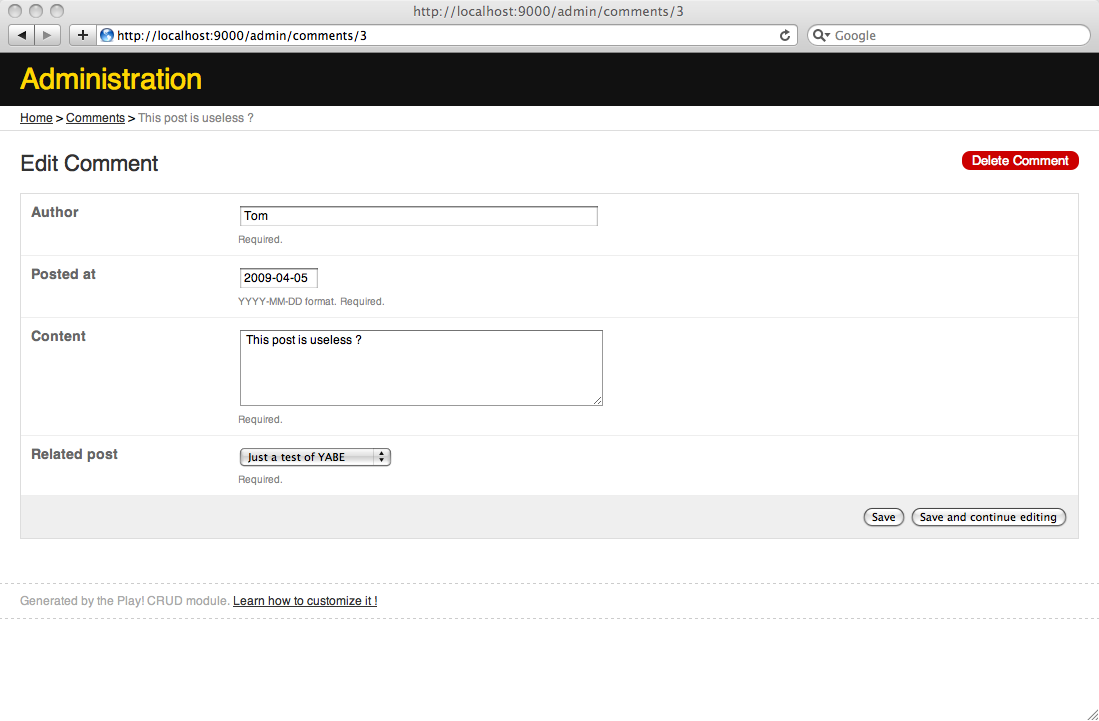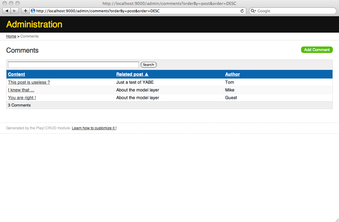 In fact, as your applications keep the master, you can really override any action or template provided by the CRUD module. For example if we want to customize the ‘comments list’ view, we just have to provide another /yabe/app/views/Comments/list.html template.