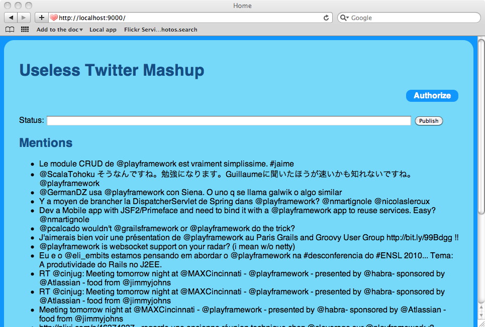 The play.libs.WS library allow your Play application to behaves like a web client. In this release we have introduced a new asynchronous implementation based on AsyncHttpClient. This new implementation provides new xxxAsync methods that allow you to fetch remote resources asynchronously.