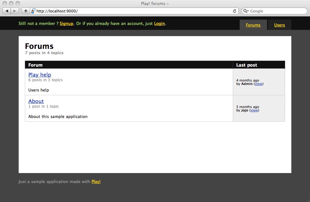 Play comes with the following set of sample applications in the the samples-and-test/ directory, in the framework installation path. We use them to run our automated test suite, and you can take a look at them to discover typical Play usages.