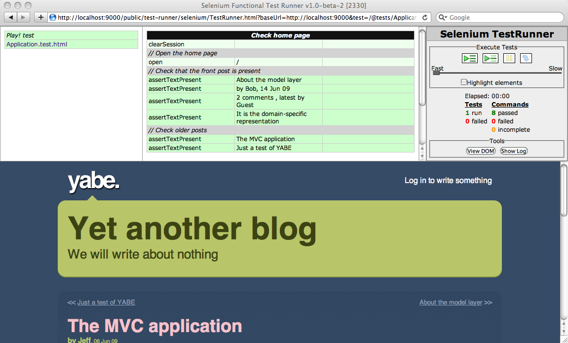Of course we’ve already written unit tests in order to test all the yabe model layer functionality. And it’s great as it will ensure that the blog engine’s core functionality is well tested. But a web application is not only about the ‘model’ part. We need to ensure that the web interface works as expected. That means testing the yabe blog engine’s controller layer. But we even need to test the UI itself, as for example, our JavaScript code.