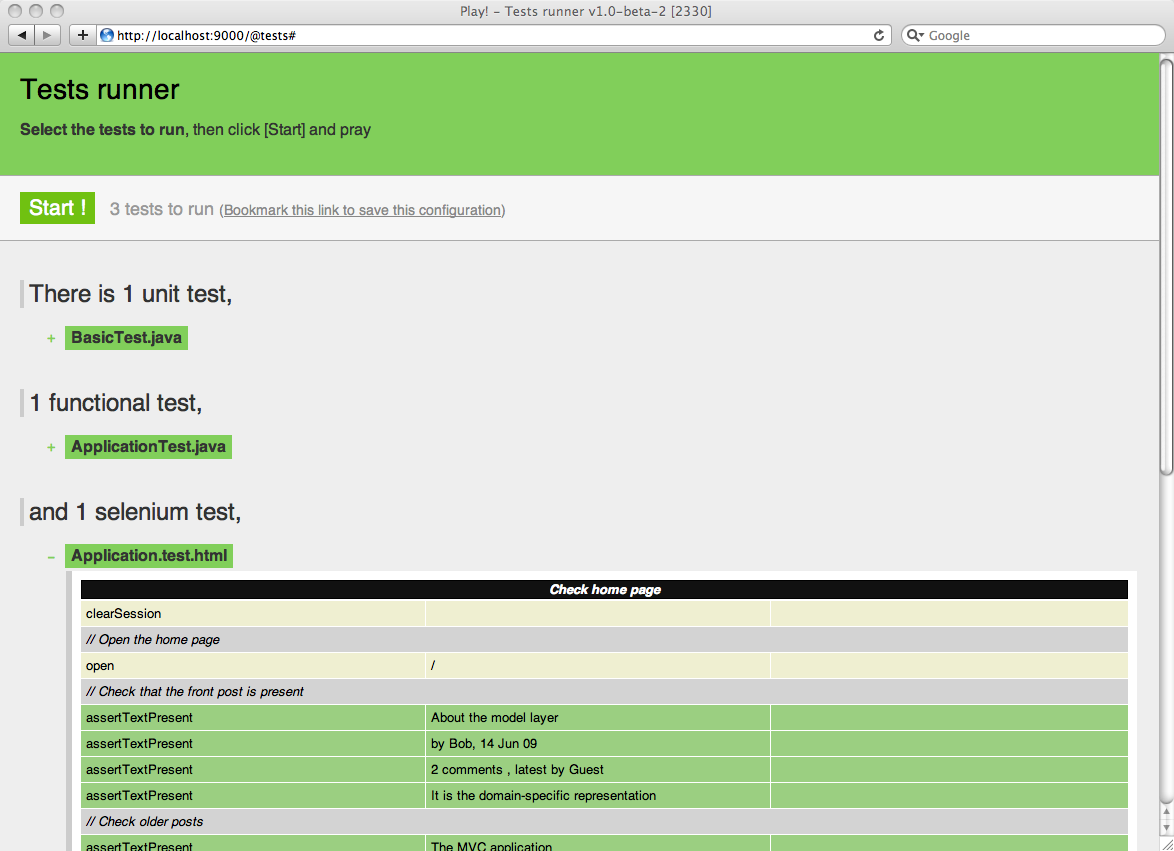 Well, we could continue to test all the application functionalities this way, but it’s not the best way to test an HTML-based web application. As our blog engine is intended to be executed in a web browser, it would be better to test it directly in a real web browser. And that’s exactly what Play’s ‘Selenium tests’ do.