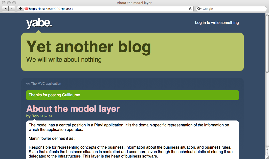 It’s great, but it lacks a link to go back to the home page. Edit the /yabe/app/views/main.html template to complete the title link: