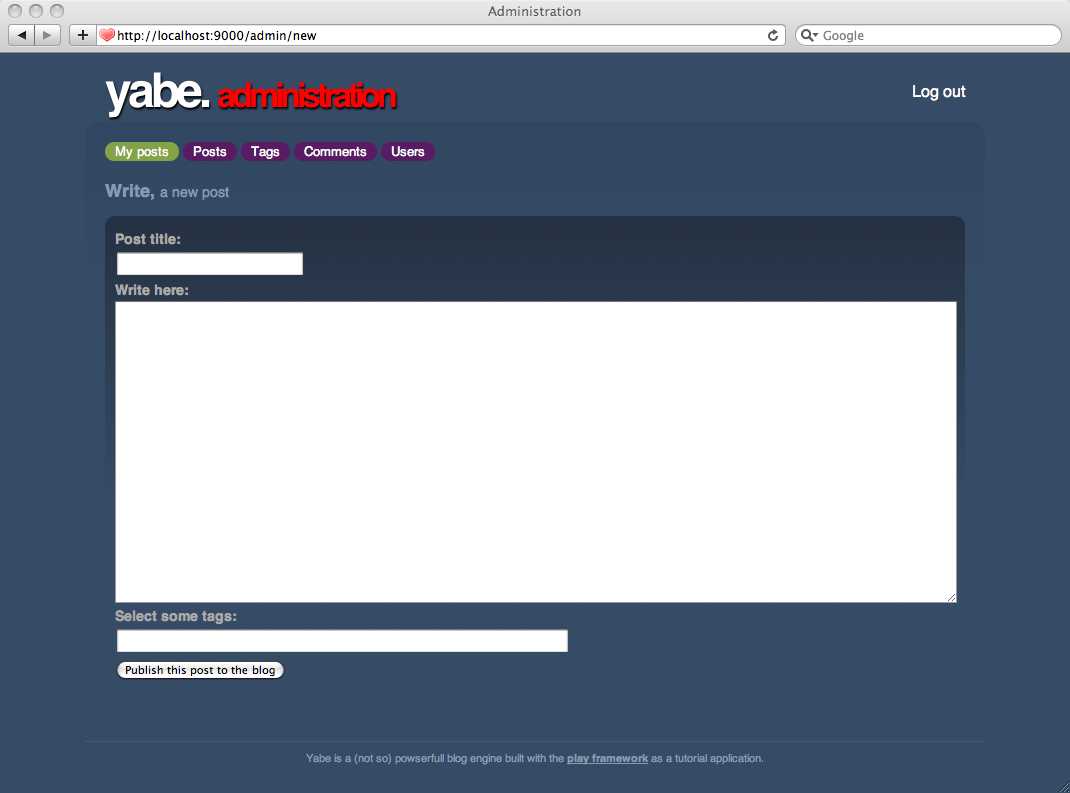 Now we have to complete the Admin.save action to handle correctly the form submission. It will create a new Post object, convert the tag list to a real Tag objects set, validate all the fields and save it. If there is any problem it will redisplay the form to show the errors.