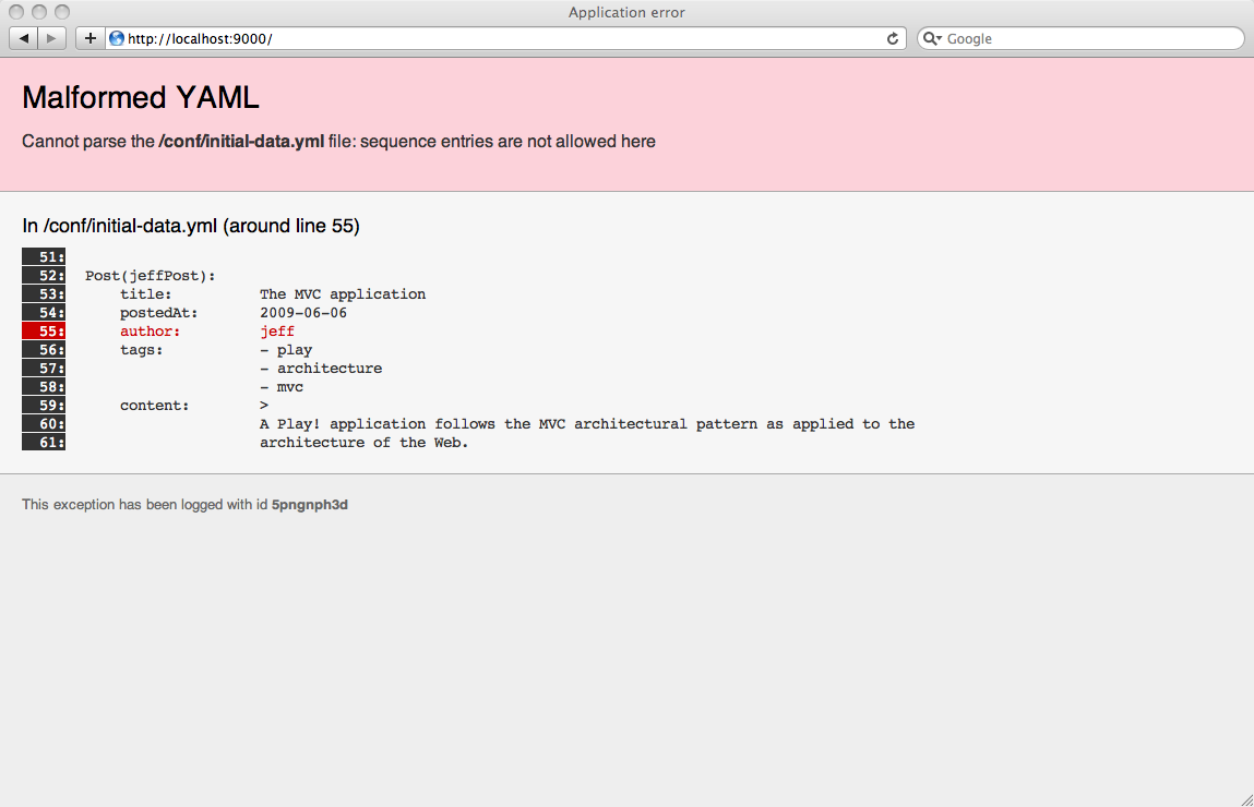 You need to restart your application to force loading of the new initial data set. Note how Play even tells you about problems in YAML files: