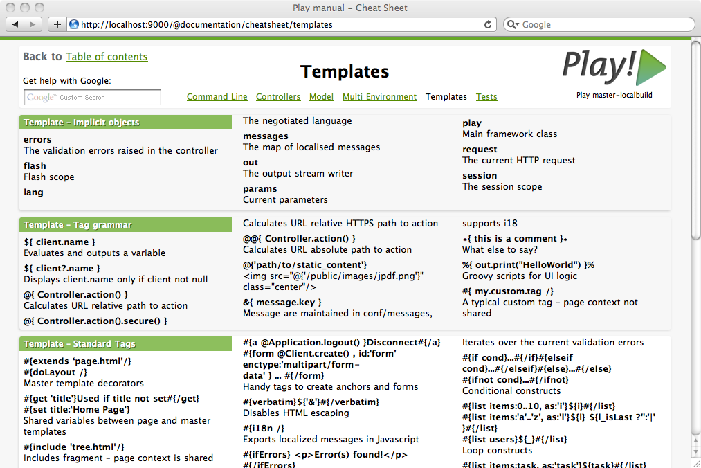 The Play documentation now includes several Cheat sheets that provide a quick reference for the common Play functions. They can be easily printed.