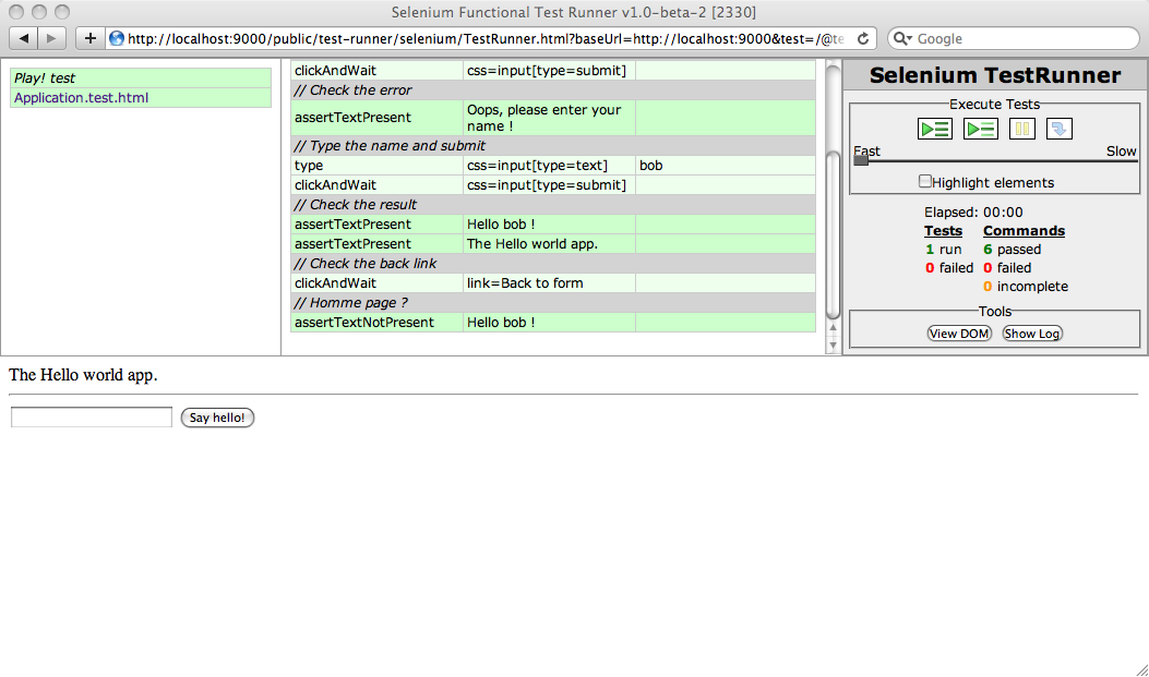 The default test suite of a newly created Play application already contains a selenium test. Open the helloworld/test/Application.test.html file: