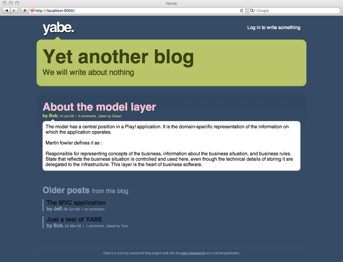 One way to inject default data into the blog is to load a fixture file at application load time. To do that we will create a Bootstrap Job. A Play job is something that executes itself outside of any HTTP request, for example at the application start or at specific interval using a CRON job.