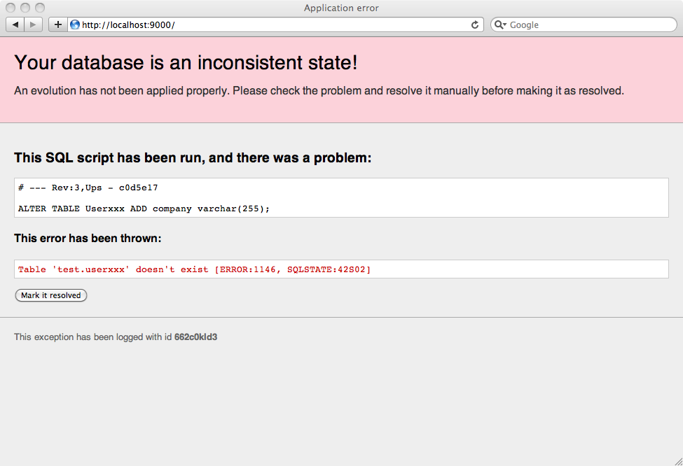 Sometimes you will make a mistake in your evolution scripts, and they will fail. In this case, Play will mark your database schema as being in an inconsistent state and will ask you to manually resolve the problem before continuing.