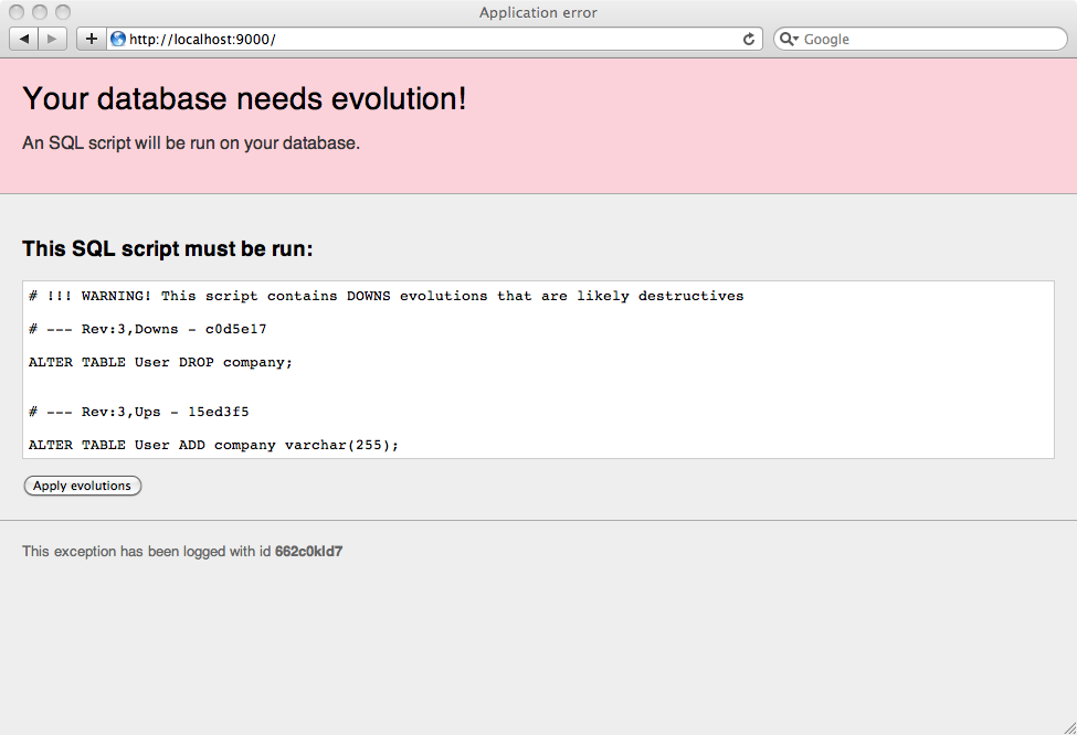 If you agree with the SQL script, you can apply it directly by clicking on the ‘Apply evolutions’ button.