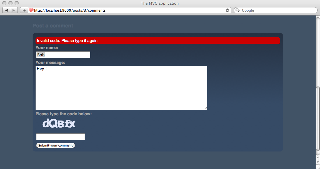 Second, remember that Play is a stateless framework. We want to manage things in a purely stateless way. Typically, what happens if a user simultaneously opens two different blog pages with two different captcha images? We have to track the captcha code for each form.