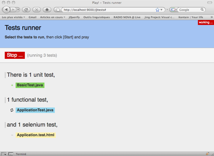 In this mode, Play will automatically load the test-runner module. This module provides a Web based test runner, available at the http://localhost:9000/@tests URL.