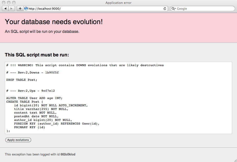 If you agree with the SQL script, you can apply it directly by clicking on the ‘Apply evolutions’ button.