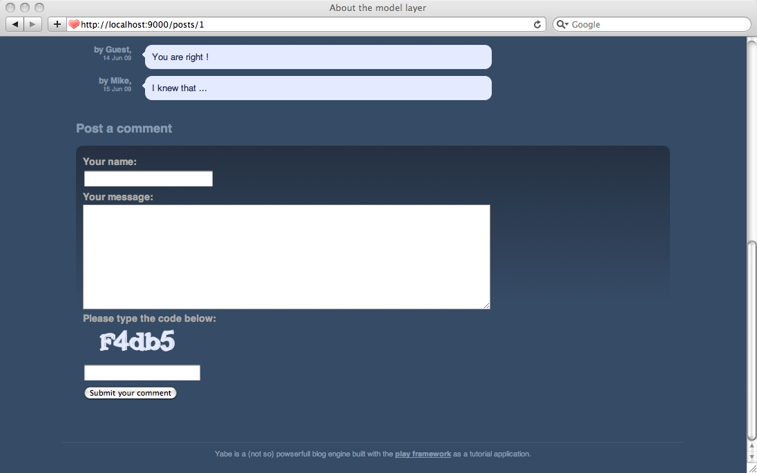 Second, remember that Play is a stateless framework. We want to manage things in a purely stateless way. Typically, what happens if a user simultaneously opens two different blog pages with two different captcha images? We have to track the captcha code for each form.