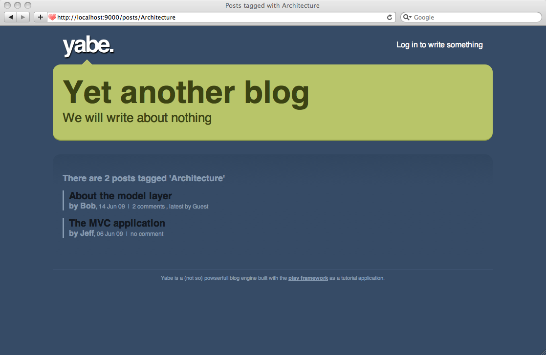 Finally, we just have to create the /yabe/app/views/Application/listTagged.html template that will be used by the new listTagged action: