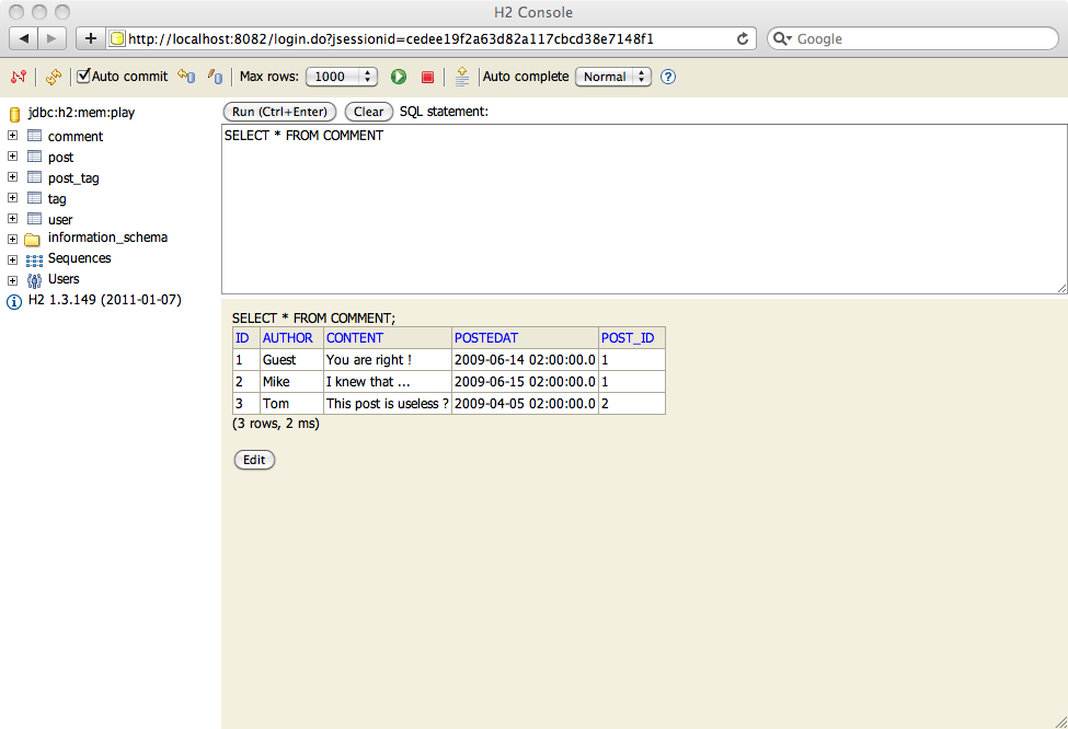 As a nice side effect, H2 provides a Web console, that you can launch using the /@db url of any Play application using db=mem as configuration.