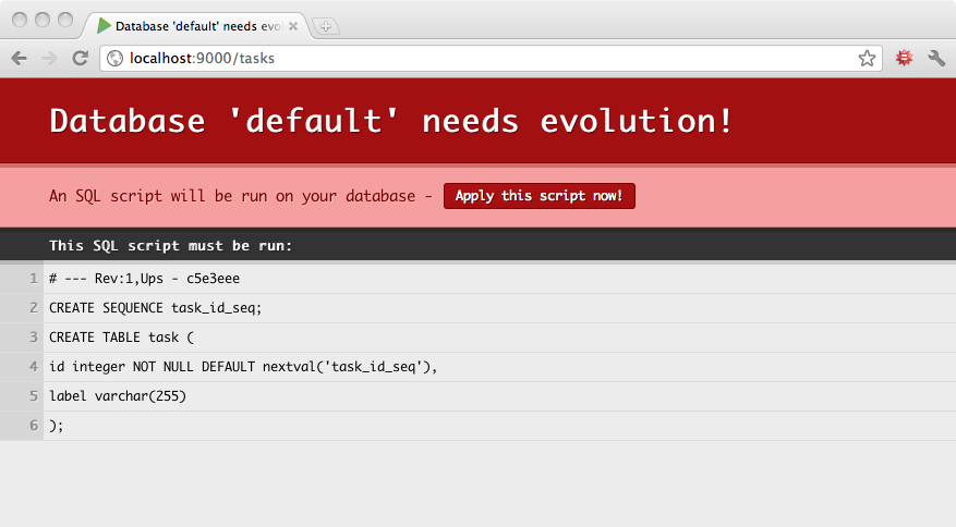 Now if you refresh your browser, Play will warn you that your database needs evolution: