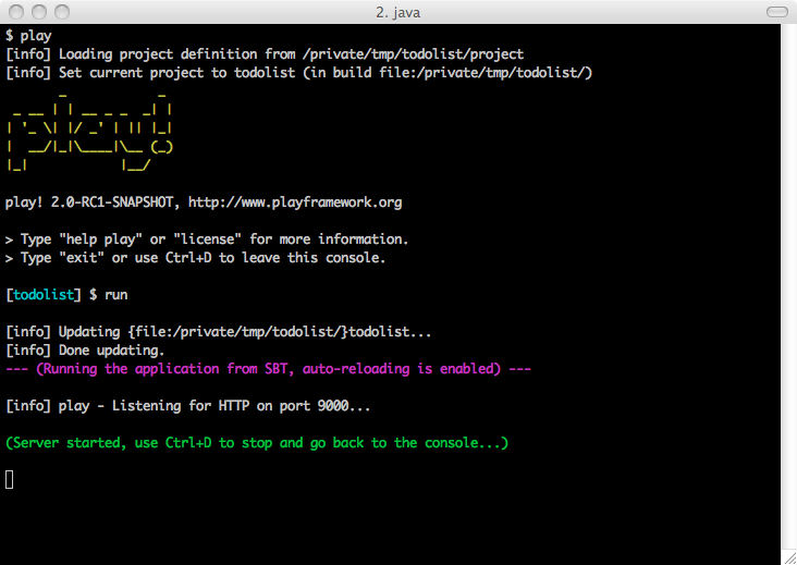 Once you have an application created, you can run the Play console. Go to the new todolist/ directory and run: