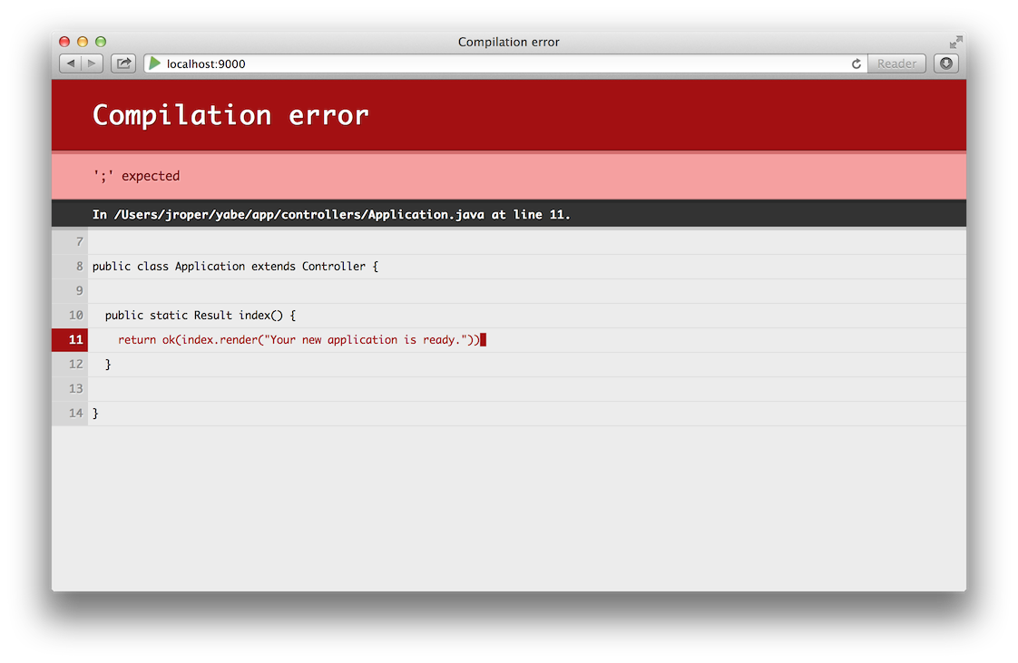We can try to edit the controller file to see how play automatically reloads it. Open the app/controllers/Application.java file in a text editor, and add a mistake by removing the trailing semicolon after the ok() call: