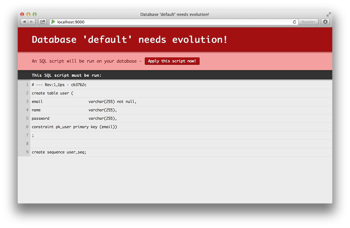 Play has automatically detected that you’ve added a new model, and has generated a new evolution for it. An evolution is an SQL script that migrates the database schema from one state to the next in your application. In our case, our database state is empty, and Play has generated scripts that create the tables. For now during the early stages of development, we will let Play to continue to generate these scripts for us. Later on in the project lifecycle, you will switch to writing them yourself. Each time you see this message, you can safe click the apply button.