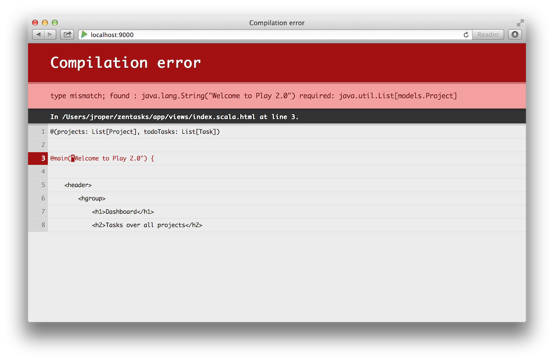 Uh oh! We have a compile error. We haven’t updated the call to the main template from our index template to pass a list of projects instead of a string. Let’s fix that now, by editing app/views/index.scala.html: