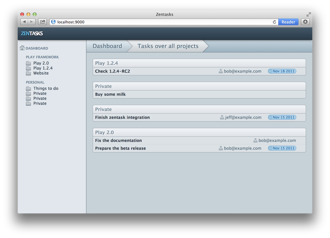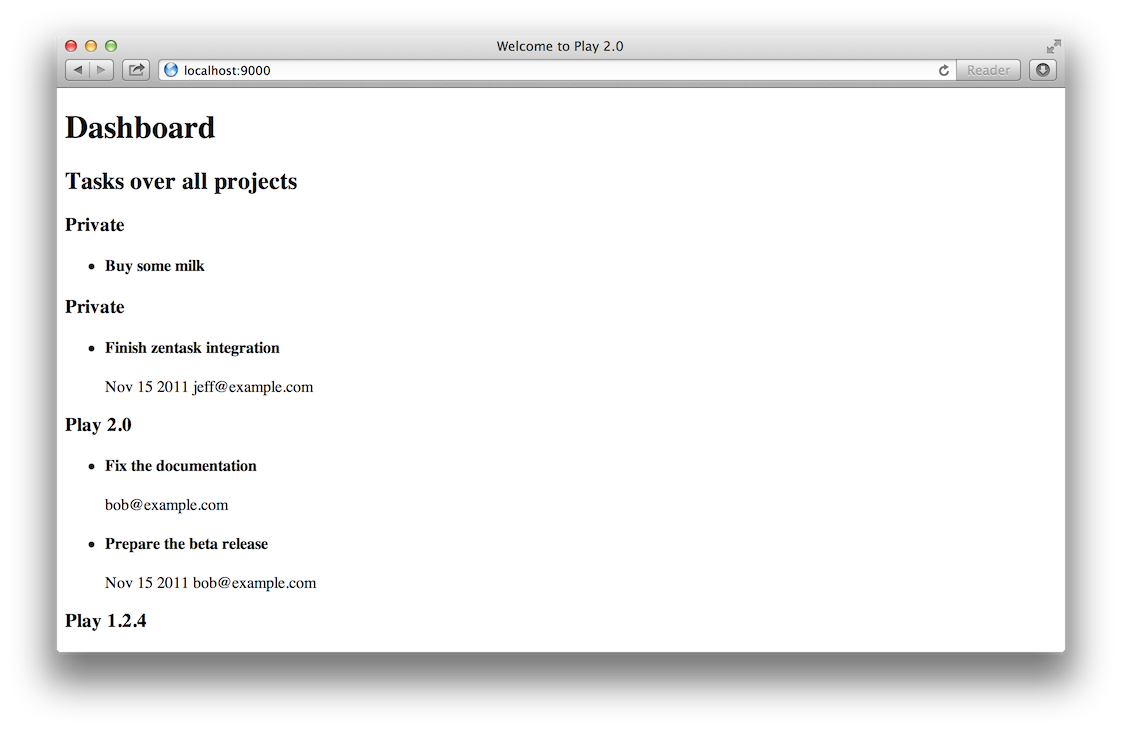 Now run the application using play run and display the http://localhost:9000 page in the browser.