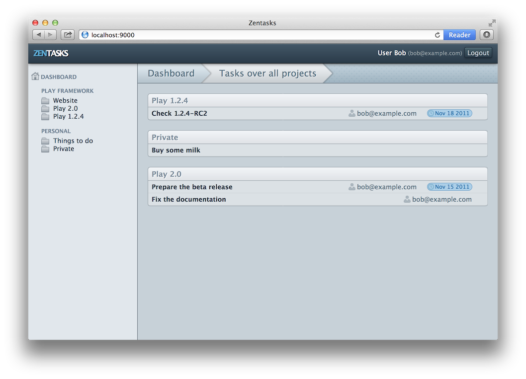 Let’s put the name of the user in the main template next to the logout link. To get the name, we’ll actually have to load the whole user from the database. Let’s also limit the projects to the one that the user is a member of, and the tasks to the ones that the user is assigned to, using the methods that we’ve already implemented on our models.