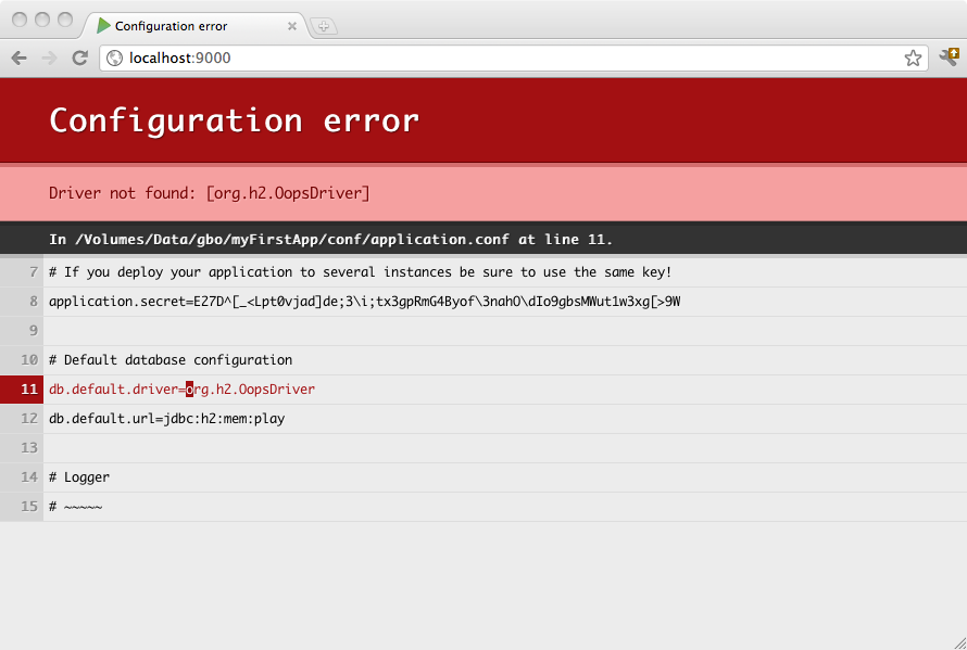 Then you must configure a connection pool in the conf/application.conf file. By convention, the default JDBC data source must be called default and the corresponding configuration properties are db.default.driver and db.default.url.