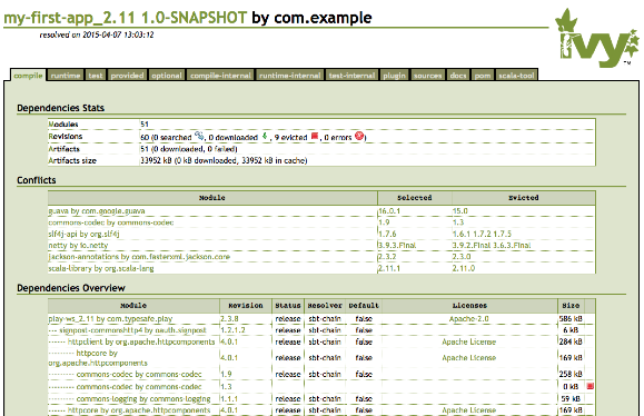The reports can be found in the target/resolution-cache/reports directory of your project, one is generated for each scope in your project, and are named organization-projectId_scalaVersion-scope.xml, for example, com.example-my-first-app_2.11-compile.xml. When opened in Firefox, this report looks something like this: