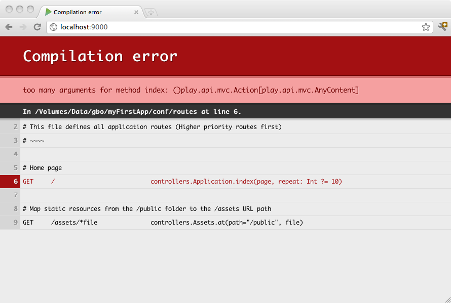 Routes are defined in the conf/routes file, which is compiled. This means that you’ll see route errors directly in your browser: