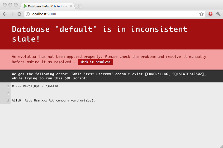 Sometimes you will make a mistake in your evolution scripts, and they will fail. In this case, Play will mark your database schema as being in an inconsistent state and will ask you to manually resolve the problem before continuing.