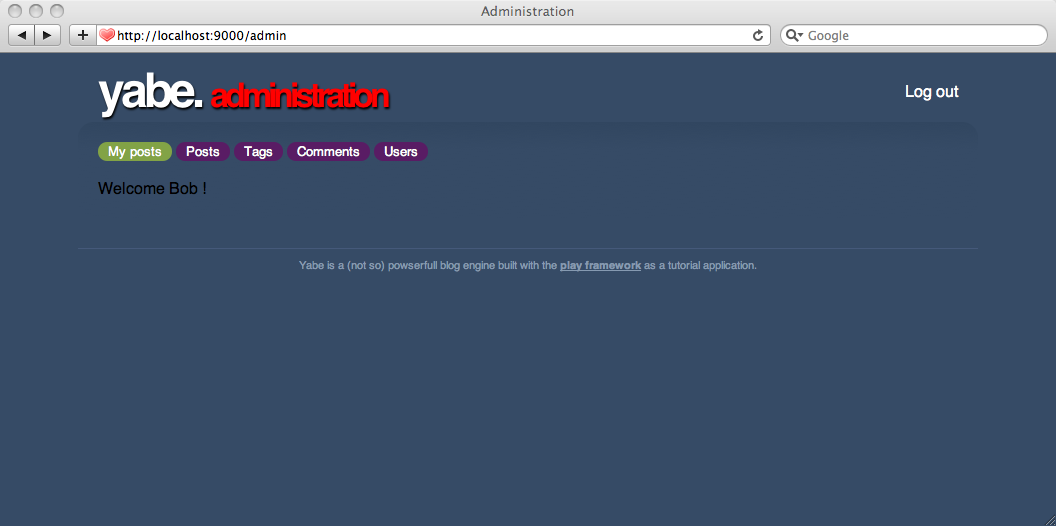 見ての通り、これはブログエンジンのフロント部分に使用したテンプレートととても似ています。 Log in リンクを、secure モジュールが提供する Secure コントローラの logout アクションをコールする Log out リンクで置き換えました。