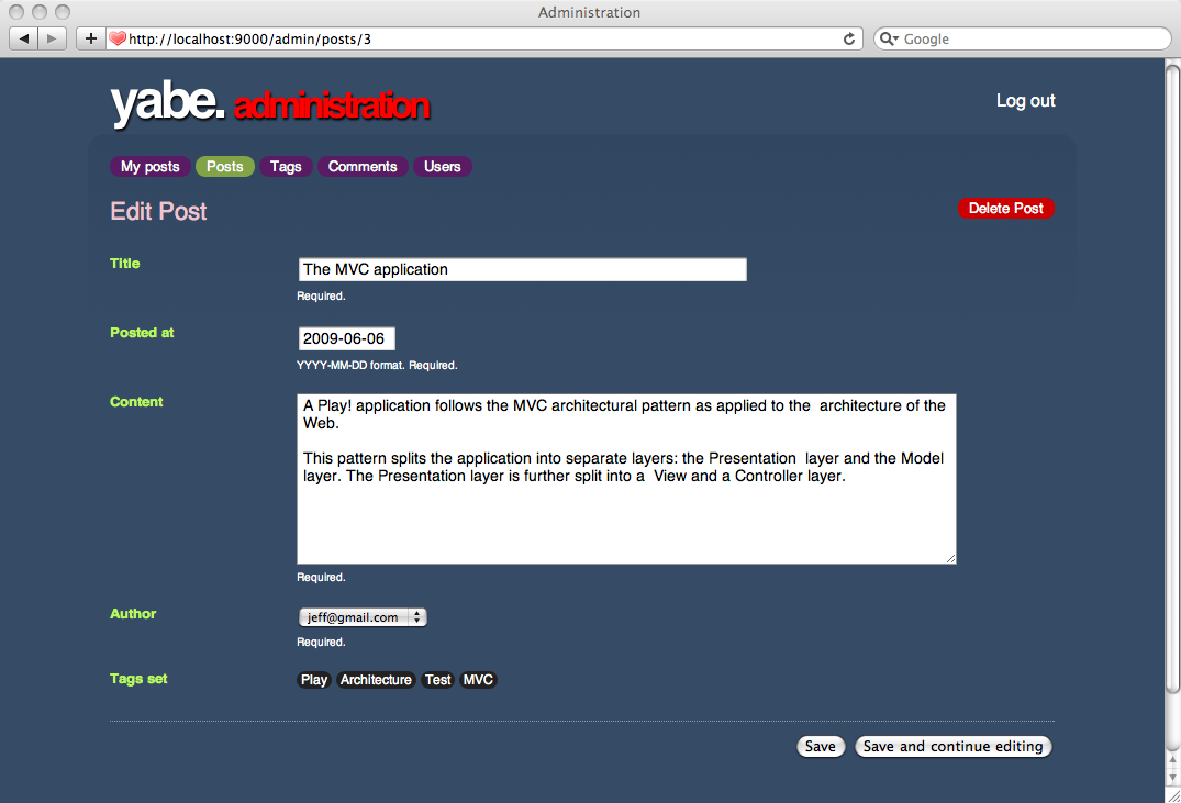 それでは、これを yabe/app/views/Admin/index.html テンプレート中で使用してみましょう: