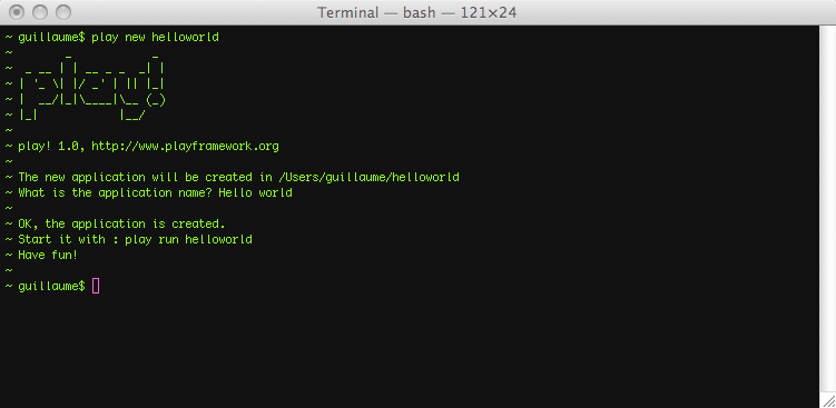 Play が正しくインストールされたので、いよいよ hello world アプリケーションを作成します。Play アプリケーションの作成は、Play コマンドラインユーティリティによって完全に管理されており、とても簡単です。Play コマンドラインユーティリティは、すべての Play アプリケーション間において標準的なプロジェクトレイアウトを割り当てます。