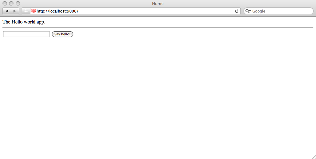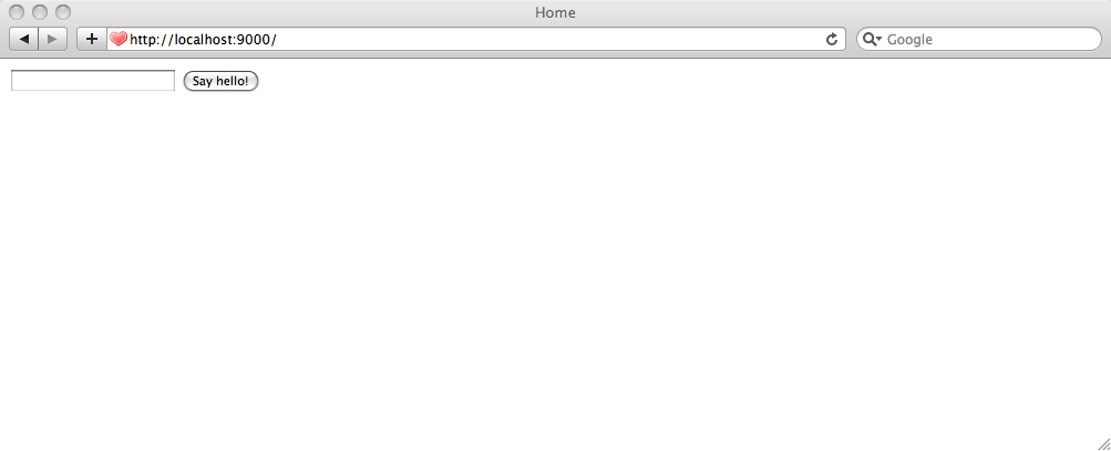 Application.sayHello アクションを起動できる URL を自動的に生成するよう Play に問い合わせるには @{...} 記法を使用します。さあ、ブラウザ内のトップページをリフレッシュしましょう。