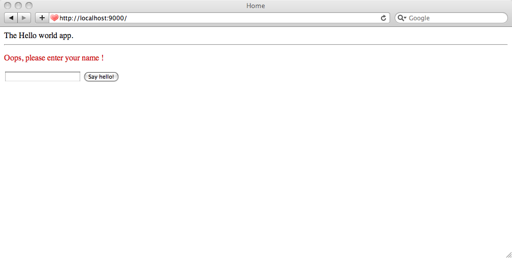 さて、何かエラーがあれば error メッセージを表示しなければなりません。 helloworld/app/views/Application/index.html を編集してください: