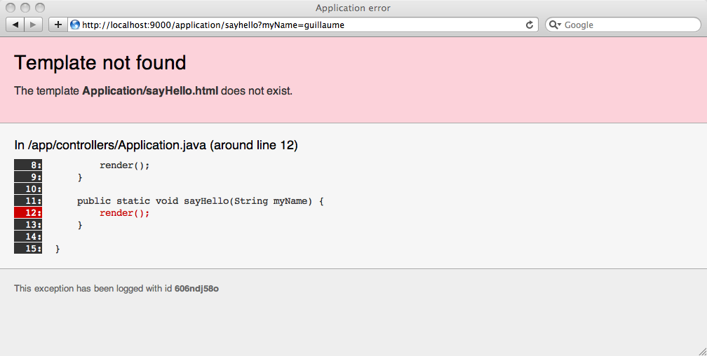 おっと、エラーです。存在しない Application.sayHello アクションを参照していることが原因です。 helloworld/app/controllers/Application.java ファイル内にアクションを作成しましょう:
