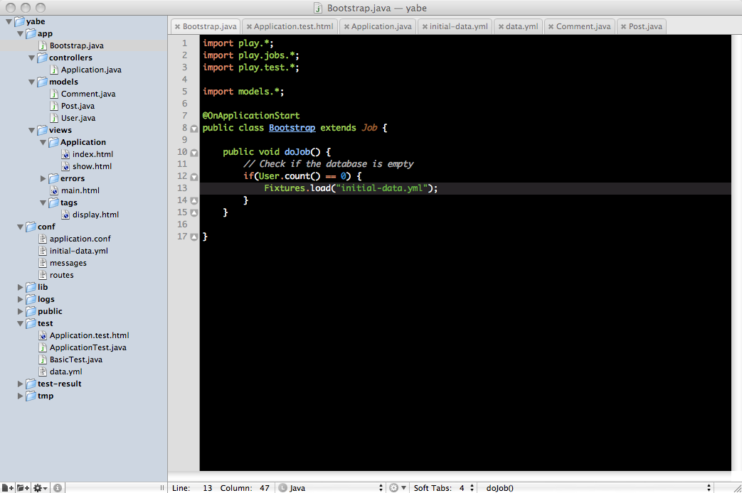シンタックスハイライトと自動補完を有効にするために $PLAY_HOME/support/textmate.zip にある Textmate バンドルをインストールします。このバンドルはコントローラとビューの行き来も容易にします。