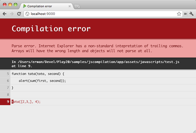 JavaScript コードは compile コマンドの実行時や、コードの変更時に自動的にコンパイルされます。他のコードのコンパイルエラー同様、JavaScript のコンパイルエラーもブラウザ上で確認できます。