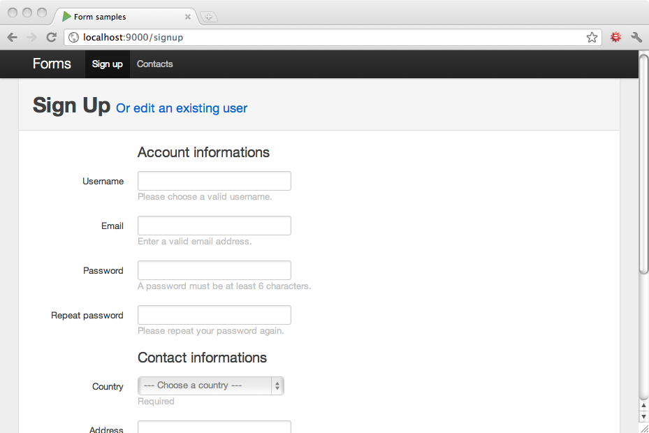 Twitter Bootstrap を利用するためには、 Play 2.0 標準のフォームヘルパーが生成する input 要素のレイアウトとは異なるレイアウトが必要になります。そのため、このアプリケーションはフォームヘルパーをカスタマイズしています。