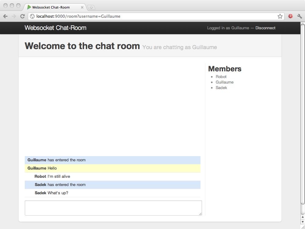 このアプリケーションは WebSocket を使用して構築されたチャットルームです。さらに、同じチャットルームで話す bot もいます。